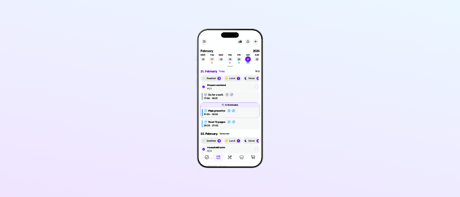 Plane deinen Tag mit Erinnerungen, Geburtstagen und Zeitblöcken für Mahlzeiten oder Aufgaben.
