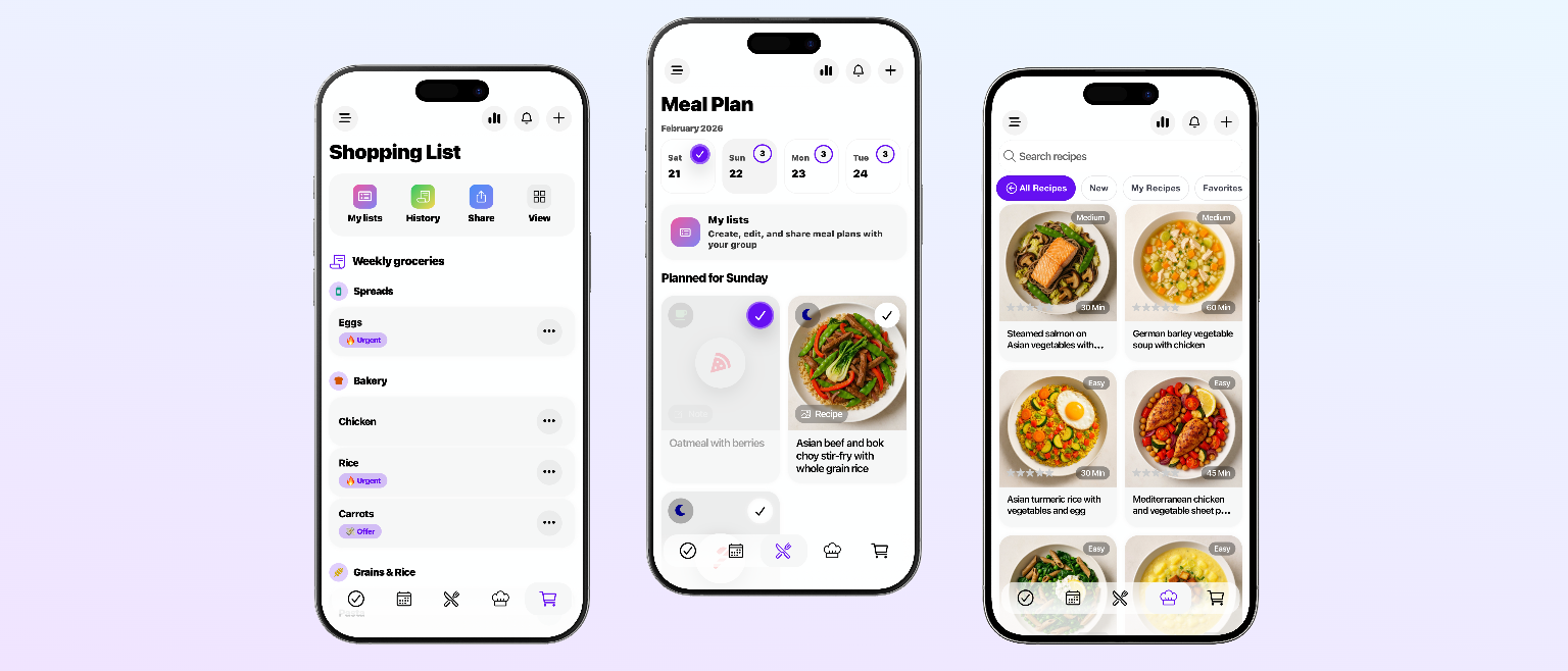 Plane deine Mahlzeiten im Voraus – individuell oder für die ganze Gruppe. Verknüpfe Rezepte. Lass dich automatisch beim Einkaufen unterstützen.