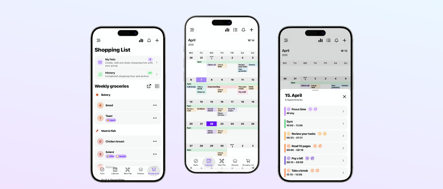 Organisiere Aufgaben, plane Mahlzeiten, teile Einkaufslisten und behalte alle Termine im Blick – mit der App für Paare und alle, die strukturiert bleiben wollen.