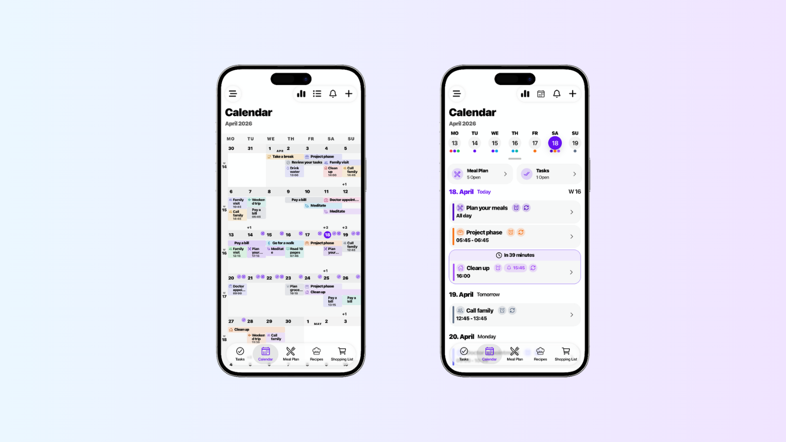 Donezo vereint Kalender, Aufgaben, Rezepte, Speisepläne und Einkaufslisten – perfekt aufeinander abgestimmt für deinen Alltag.